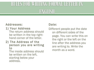 Informal letters require only the writers address. 31472 099078 70 099078 7 9903 94 17 038 3 12 202-078 70 7. Formal letters have two addresses.